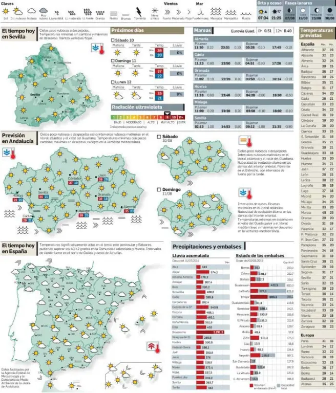 El tiempo en sevilla el tiempo en sevilla: Mapas predicción y datos del estado del tiempo para más de 224 ciudades de la provincia de sevilla: Sevilla afronta un final de semana con el calor propio de agosto pero lejos de los valores. Previsión sevilla temperatura viento velocidad precipitación ; Pronóstico meteorológico con datos de temperatura, humedad, velocidad y dirección del viento, estado del cielo, presión atmosférica, probabilidad de lluvia, etc.